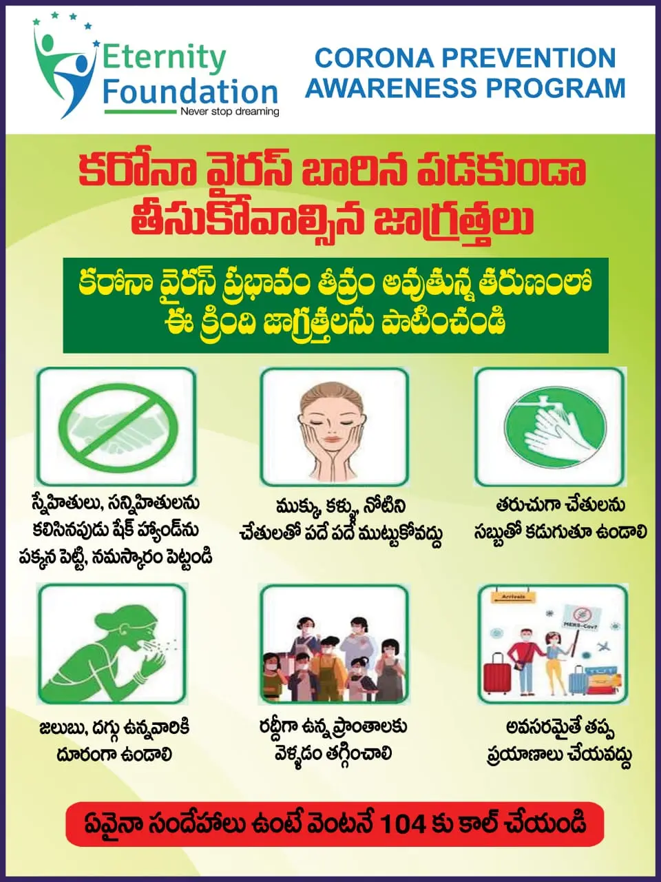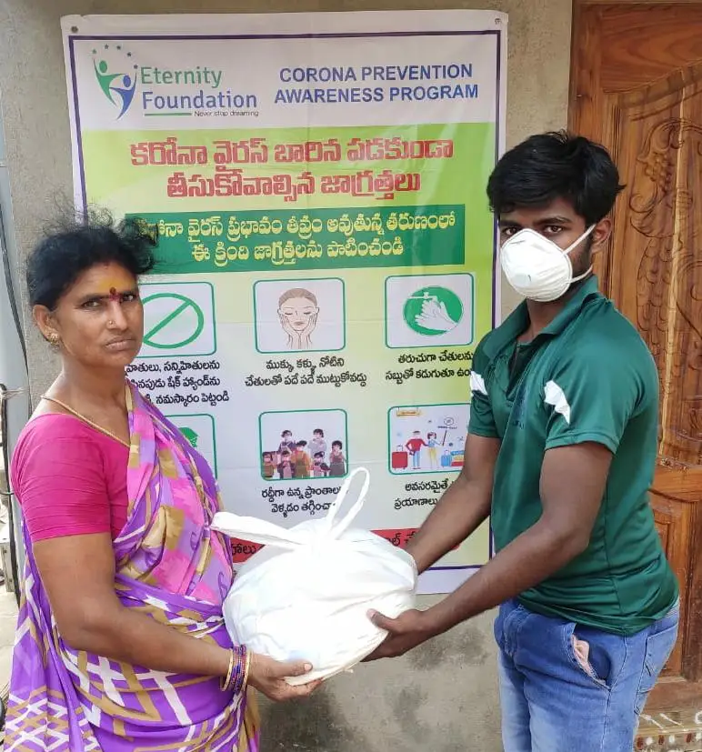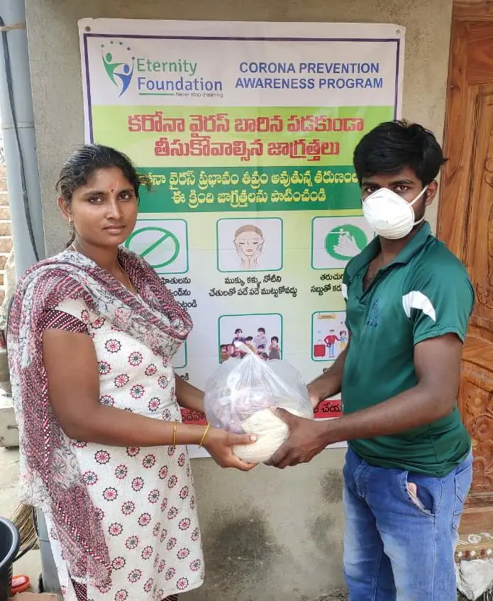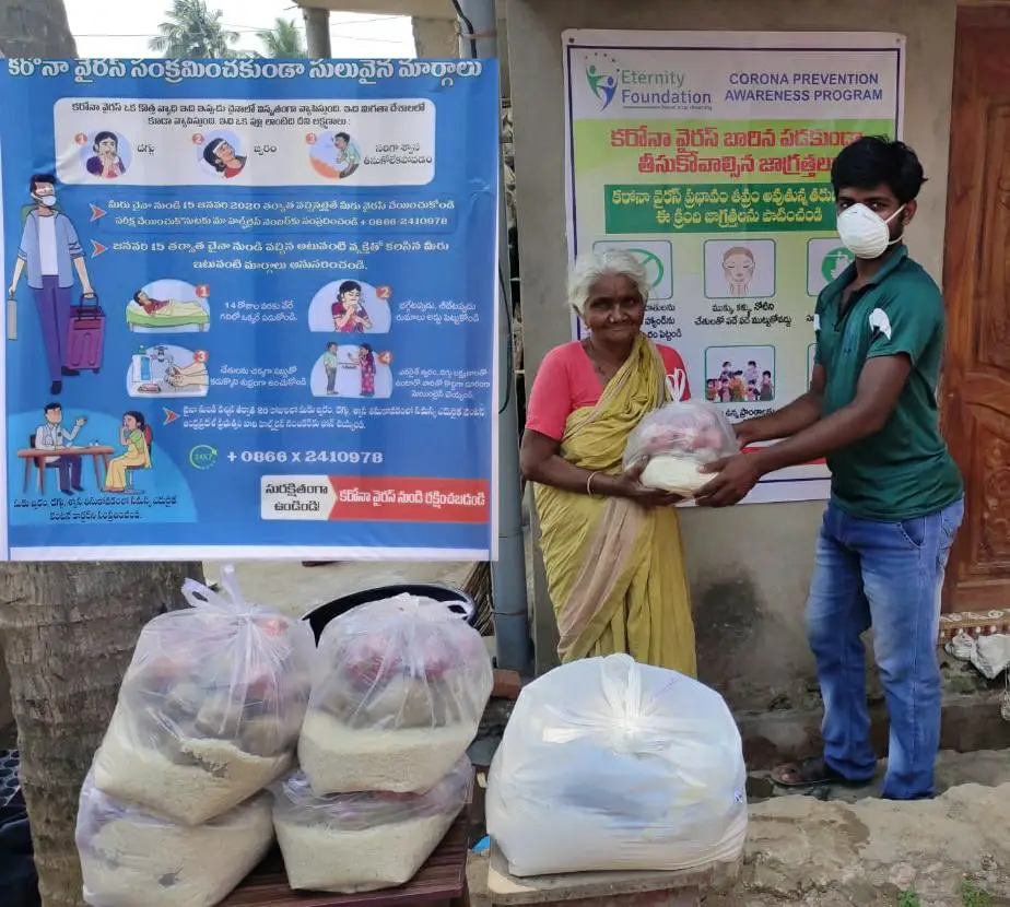 India is the largest democracy with seventh largest economy in the world having almost 140 crore population constitute 18% of the world population. Since the independence of India there were many crises faced by the Indian govt but not like the recent health crisis of COVID- 19 where main concern of the govt was to save life of the people and prevent spread of Virus. The sudden lockdown across India comes many serious consequences like Migration, Hunger, Unemployment, mobility etc. The increase in social responsibility and limited availability of resources to the Govt. is growing concern to reach out welfare to common citizen of India. The role of NGO plays a very important role to curb this situation and increase faith in democracy. Eternity foundation is the non-government organisation, HQ based in Delhi comes with Ration kit, PPE kit and awareness camp to deal the problem of hunger, awareness among villagers and safety concern of health officials. More than 200 dry ration kit were distributed among villagers of Kasimkota Mandal, District – Vishakhapatnam, Andhra Pradesh and organised a Vaccination drive with help of Govt. Institute to ensure the villager to get vaccinated. Awareness is the most important factor to deal with sudden pandemic where EF encourages people with DO and DON’T within health camp and distribute pamphlet to villagers in their local language Telegu.